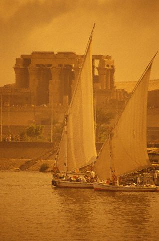 High on a hill overlooking the Nile stands the Temple of Kom-Ombo about 45 kilometers north of Aswan. The work for the actual temple began under Ptolemy VI Philometor in the early Second Century BC. Outer and inner hypostyle halls were built during the reign of Ptolemy XIII.